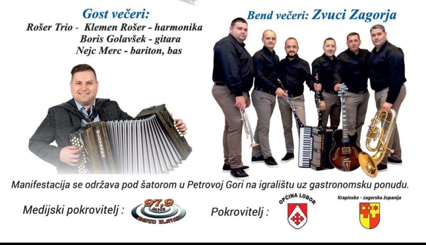 Poseban gost večeri je Rošer Trio, sastav koji čine vrhunski glazbenici Klemen Rošer (harmonika), Boris Golavšek (gitara) i Nejc Merc (bariton, bas). Glazbeni program zatvorit će popularni sastav Zvuci Zagorja.