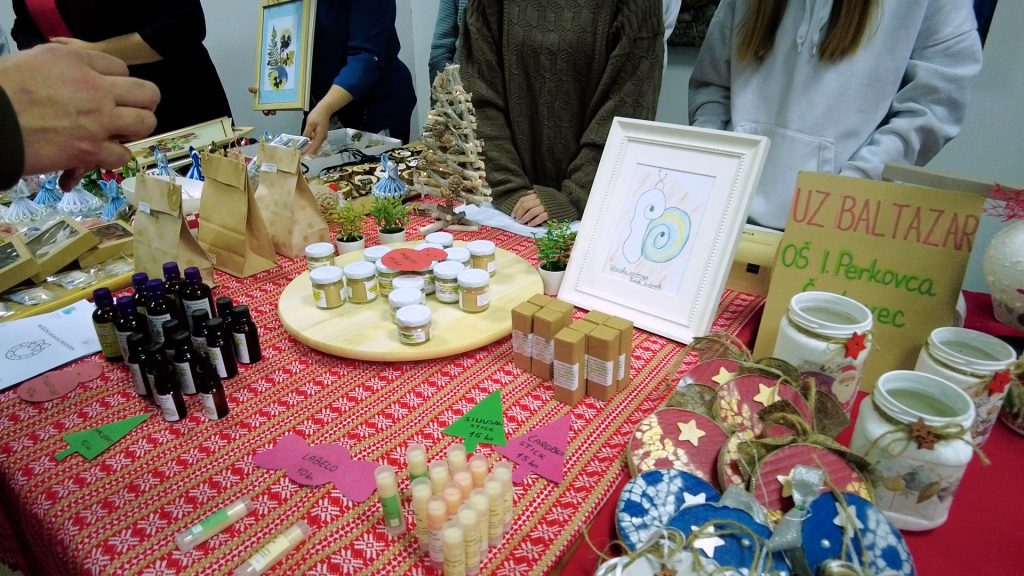 “Imamo tu svakakve kozmetičke proizvode koje smo radili s našom profesoricom Martom iz biologije. Imamo sinusane, čarobne stikove, masti, tinkture, macerata labela. Imamo poklon pakete za Božić”, rekla nam je članica Učeničke zadruge Pužek brdovečki iz OŠ Pavao Belas Gabrijela.