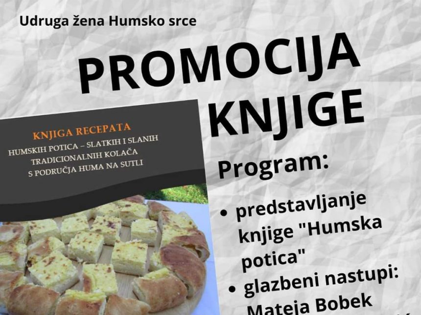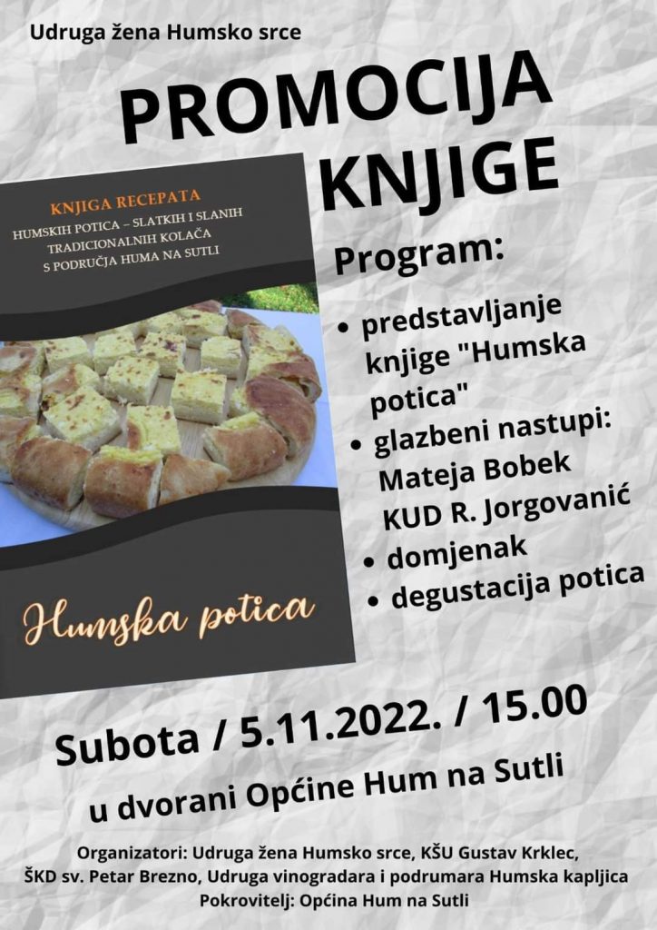 U subotu, 5. studenog će se u dvorani općinske zgrade u Humu na Sutli održati promocija knjige recepata „Humska potica“. Recepte je prikupila i uredila za objavu Tanja Topić, a promociju organiziraju Udruga žena „Humsko srce“, KŠU „Gustav Krklec“, ŠKD „Sv. Petar Brezno“ te Udruga vinogradara i podrumara „Humska kapljica“ pod pokroviteljstvom Općine Hum na Sutli.