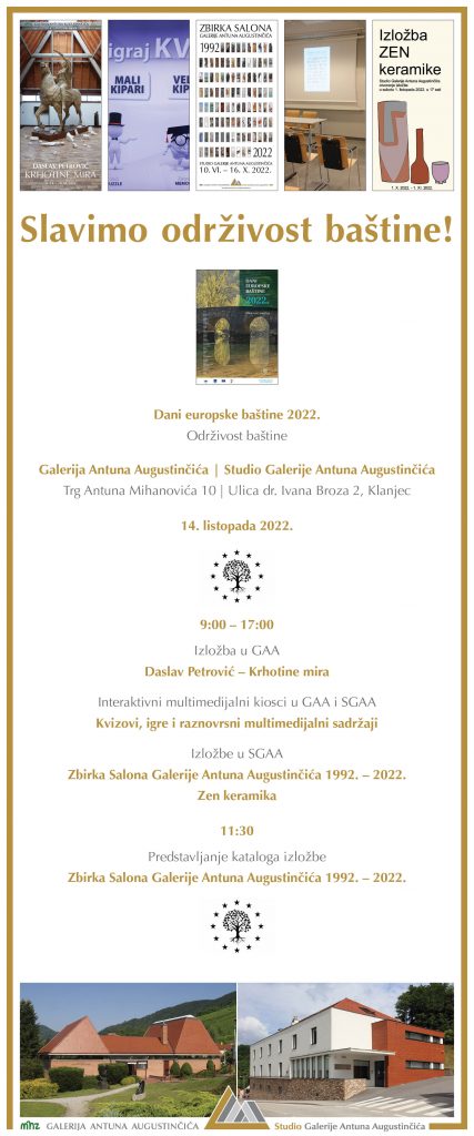 Povodom Danā europske baštine 2022. s temom Održivost baštine, u petak 14. listopada 2022. godine, od 9:00 do 17:00 sati, svečarski Vas očekujemo u Klanjcu, u Galeriji Antuna Augustinčića (Trg Antuna Mihanovića 10) i njenu Studiju (Ulica dr. Ivana Broza 2).