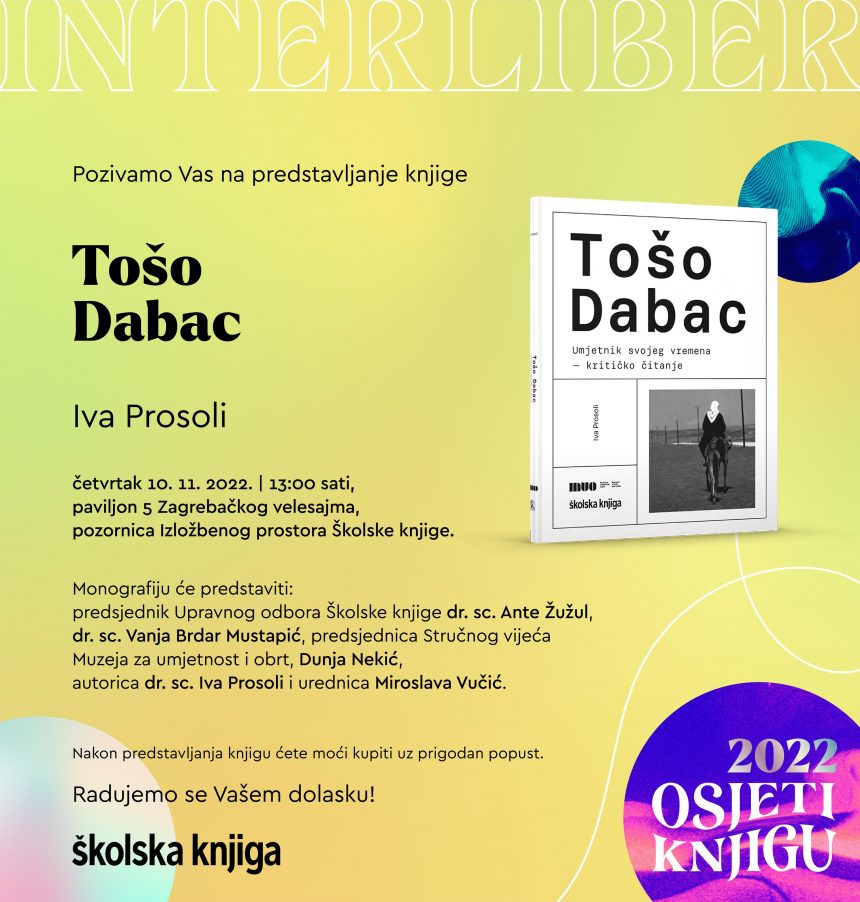 Monografija TOŠO DABAC: Umjetnik svojeg vremena – kritičko čitanje autorice dr.sc. Ive Prosoli bit će predstavljena u četvrtak, 10. studenoga 2022. u 13 sati na izložbenome prostoru Školske knjige u paviljonu 5 Zagrebačkog velesajma.
