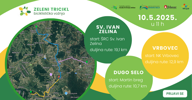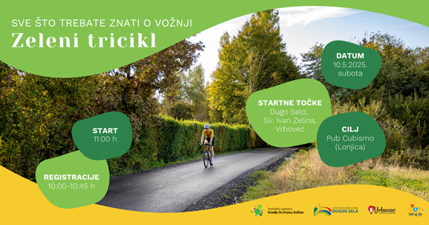 U subotu, 10. svibnja 2025. godine, na području Dugog Sela, Sv. Ivana Zeline i Vrbovca, održat će se rekreativna biciklistička vožnja Zeleni tricikl – tri grada, dvije pedale, jedna avantura. Riječ je o zajedničkoj vožnji koja na dva kotača spaja tri susjedna grada, a završava velikim druženjem na cilju.Sudionici će moći odabrati jednu od tri startne točke — ŠRC Sv. Ivan Zelina, NK Vrbovec ili Martin breg u Dugom Selu, a cilj svih ruta je Pub Cubismo u Lonjici, gdje će ih dočekati zajedničko druženje uz glazbu, ukusne zalogaje i dobru atmosferu.
